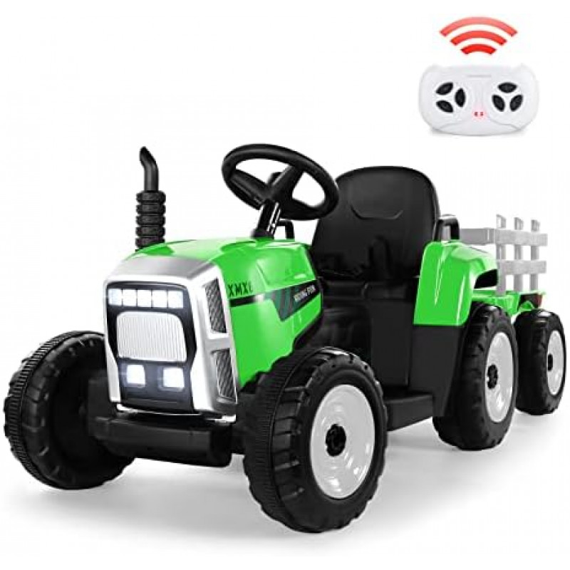 PARENT CONTROL: Enjoy happiness with your baby and take your little child ride on tractor. REALISTIC DRIVING: Fasten the seat belt, press the power switch, put the gear, step on the accelerator pedal, just go go!!! LOVE MUSIC: Play your child's favorite music and stories through the Blutooth Music/USB in an adjustable volume. DETACHABLE TRAILER: Best partner to little gardener transport toys, dolls, flowers etc. Take it down for a wild ride in the farm if no need. PLAY TIME: Use a 12V 7Ah high-quality and stable battery, tractor runs for 40-50 mins after a full charge. Two 25W motors, the speed can reach 2-5mph.