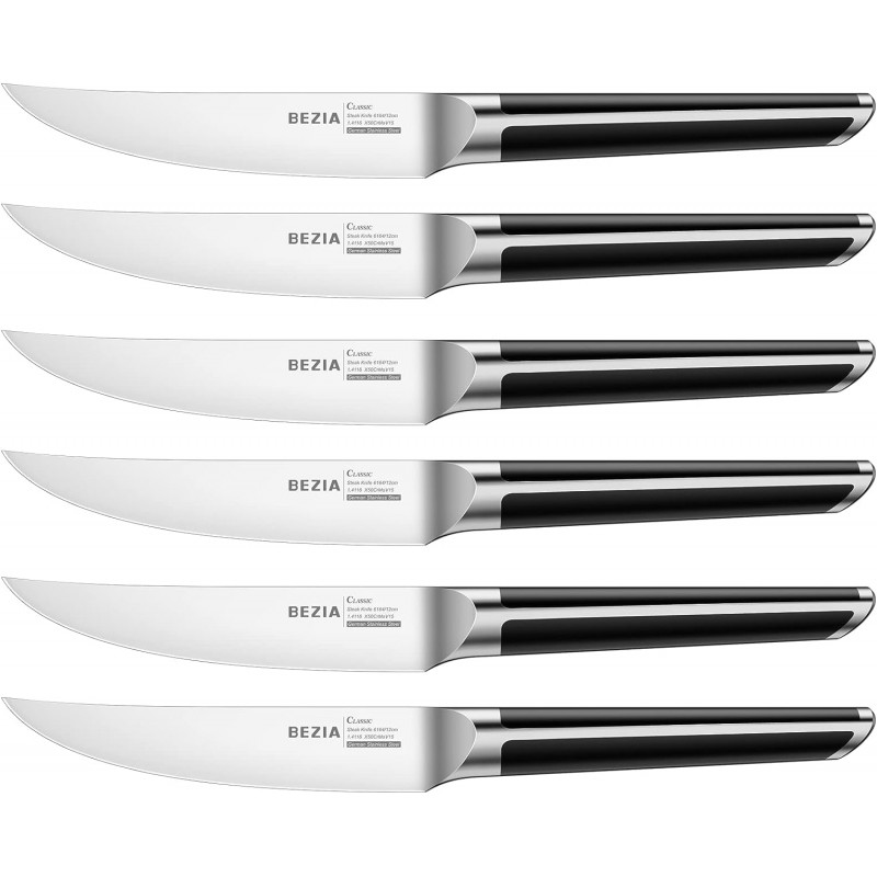 PROFESSIONAL QUALITY - BEZIA steak knives blades are made of German stainless steel 1.4116 X50CrMOV15. After heat treatment, precision forging and other multiple processes, the blades have excellent corrosion and oxidation resistance; the blade is polished to 14-16° on each side and has a Rockwell hardness of 57+ to maintain long-lasting sharpness. TRIANGLE DESIGN - The full tang handle adopts a stylish triangle design for a more comfortable grip, ABS material known for its comfort, strength and stability to maximize the strength and durability of the steak knife, balanced weight distribution and ergonomic design to minimize fatigue and improve cutting precisio for slicing ribeye steaks and tenderloins with ease. NON-SERRATED EDGE - Allows for smooth slicing like butter on steaks and other foods, no tears or ridges, maintains the natural texture of the steak and locks in the original flavor and nutrition of the steak, the upward curved tip is designed to help easily separate the meat from the bone, it also cuts cleanly through thick or hard steaks or side dishes. MULTI-PURPOSE USE - The 6-piece steak knives set is versatile and can be used for BBQ, gathering, dinner, wedding and kitchen, camping, restaurant, hotel. They are also suitable for slicing and carving meat, turkey, pizza, ham, brisket, fish, vegetables, fruit and more, especially beef and steak. MAINTENANCE - Gently rinse the steak knives after use and dry them immediately with a soft cloth, it will help keep the blades long-lasting sharp and not easy to rust. We are committed to each customer's 100% satisfaction with our products and services. If you have any questions about BEZIA's products, please feel free to contact us.