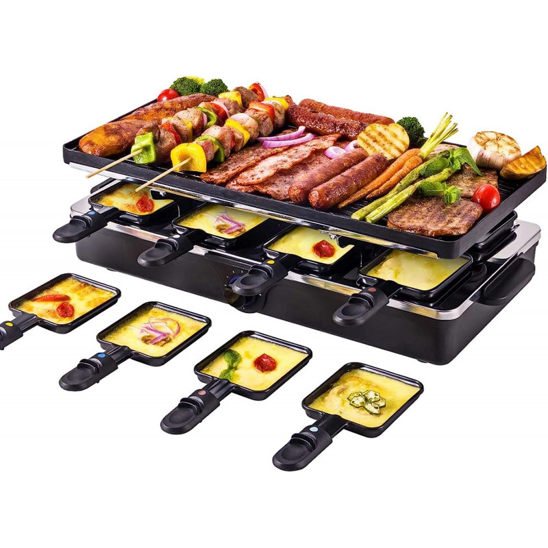 【2-IN-1 Korean BBQ Electric Griddle Grill Reversible】20 x 9 inches nonstick extra-large cooking surface can cook multiple foods for 8 people at one time. This Swiss-inspired raclette grill is a grill & griddle comb. The griddle side makes it perfect for creating delicious crepes, pancakes, quesadillas, fajitas, and eggs. The grill side allows you to create a beautiful grill mark on steaks, bacon, chicken, and vegetables. 【PFOA Free Non-Stick Coating】The electric indoor grill griddle with extra large non-stick coating on the surface. Food slides right off the nonstick surface making clean-up easier! The grill plate can be taken off and cleaned directly with soapy water plus dishwasher safe. 【8 Independent Raclette Trays】The electric Korean BBQ grill is equipped with 8 individual heat-resistant raclette shovels and 8 wooden raclette spatulas so that family and guests can control the cooking of their own individual portions, and everyone involved to cook tasty bites and enjoy a good friendship at the same time. There’s no right or wrong way to raclette and you don't even need to use a recipe. You can also cook Korean BBQ on it. 【Adjustable Temperature & 3rd Gen. Even Control Tech.】This 3rd technology is and energy-saving, with better performance. It can quickly heat up near to 430 °F (the best temperature for the grill, rotate to the far right) and maintain it for a long time. In contrast, the other electric raclette turns sometimes hot and sometimes cold when cooking, gets a poor performance. Tips: it would take 15-20 minutes to rise to this constant temperature. Please preheated in advance. 【Worry-Free Customer Service】We have been committed to providing a pleasant shopping experience for you with hassle-free returns within 30 days. ETL Certified, Please rest assured when using it. If you have any problems, please feel free to contact us. When you're using the raclette table grill with family and friends, just put out a variety of cheeses, meats, and vegetables and watch the conversation begin.