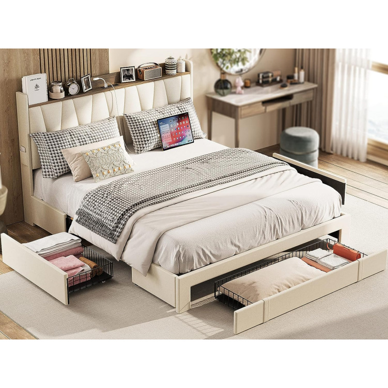 [Storage Headboard with Charging Station]The queen size bed frame combines a storage headboard with a charging function for your convenience. You can put your glasses, photos on the shelf; also charge your phone, laptop within reach. [Space-saving Drawers] With 3 steel drawers under the platform bed to meet your different storage needs. The drawers are fitted with rolling wheels that can be easily pushed in and pulled out, making it easy to store a variety of bedding, clothes, etc. Special lock design of bed drawers makes them always stay in place. [Comfortable Upholstered Bed Frame] The wider headboard of the bed, filled with high-density sponge inside, soft and breathable, bringing you a comfortable backrest experience. There are small pockets for storage on both sides [Sturdy Construction & Strong Support] In addition to the solid metal frame and central cross design of 12 thickened wooden slats, we have added a heavy duty steel support bar under the headboard to give the bed frame a weight capacity of 1100 lbs. [Quick installation & Noise-Free] The Velcro design of the bed slats makes installation a breeze and the EVA silent strip between the bed and the iron frame reduces frictional noise. No box spring needed after installation, suitable for 8-12" mattresses. [Hassle-free Shopping] If there are any questions about the quality of the product or the installation, please feel free to contact us. Our customer service will provide you with a solution within 24 hours