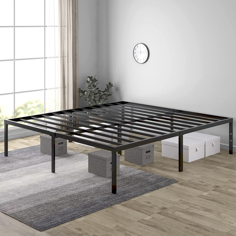 Dimension: Twin Size: 40.7” W x 77.6” L x 18.3” H, Full size: 55.9” W x 77.4” L x 18.3” H, Queen Size: 62” W x 79.7” L x 18.3” H, King size: 77.8” W x 82.1” L x 18.3” H, Weight capacity: 600 LBS Slots for Headboard Attachment: Reserved holes for standard headboards, providing a reliable anchor for easy headboard attachment. Mattress Fixing Design: Customized tape for fixing the mattress, no slipping, no box spring needed. 16.5” Under Bed Clearance: 16.5” under bed clearance for ample storage space! Store odd bits & ends under the bed to perfect that clean look of your bedroom! Easy Assembly: Embedded feature makes assembling easy. Simply insert the rubber-capped metal slats into the friction-fit support cups. All tools are labeled and packed in one box, complete full set bed frame within 30 minutes for new hands.