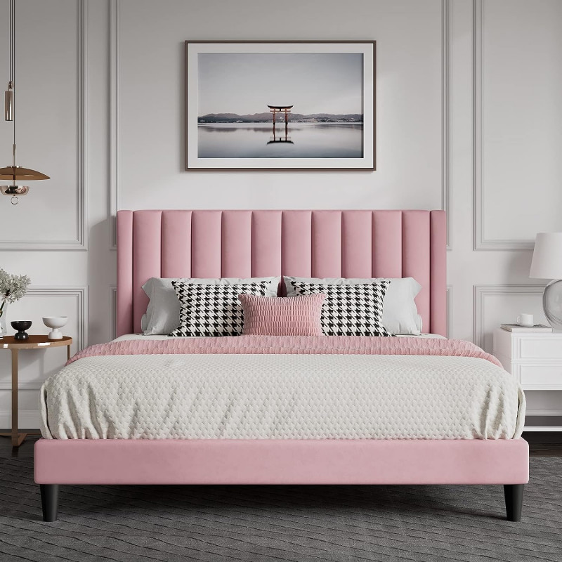 VELVET BED JUST FOR YOU: Upholstered in plush velvet, our luxurious bed is the best choice for your classy life, complete with upholstered side rails and a padded queen headboard, finally you can have style and comfy at the very same time.