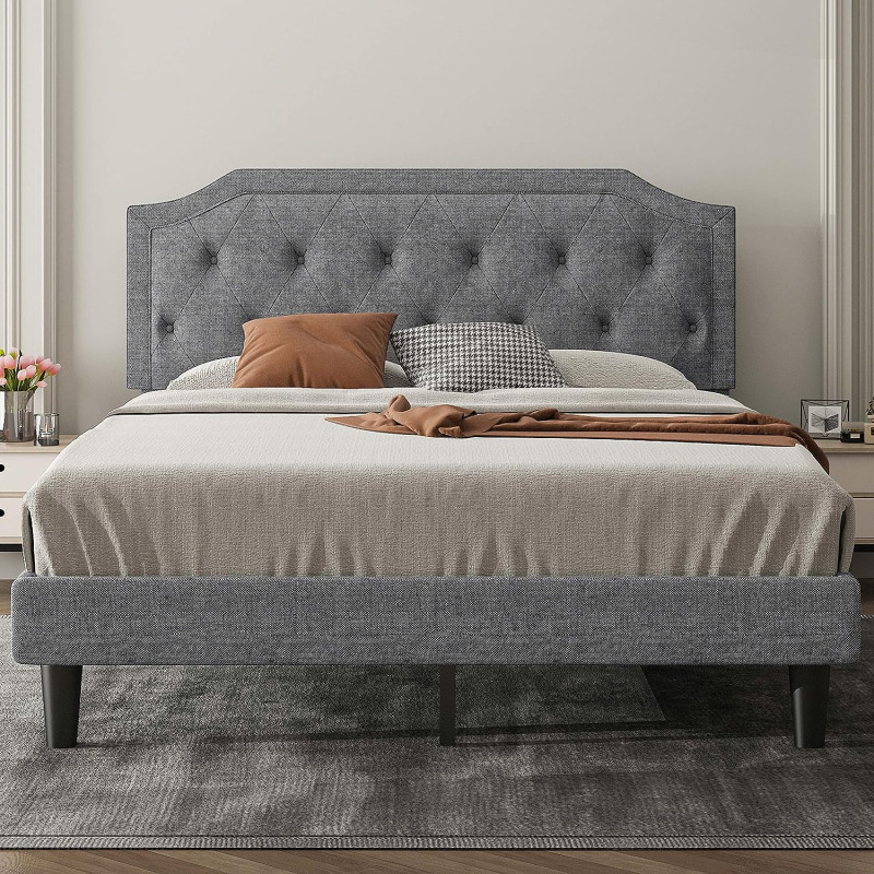 Adjustable Upholstered Headboard: The headboard with a height of 48''- 52''inches is thickly upholstered to provide you with a comfortable backrest function. Sturdy and Durable: The product uses thickened wood to make the bed frame more solid and not easy to shake, and the linen fabric is more skin-friendly and easy to maintain. Thoughtful Design: The modern style bed frame with curved bed corners and classic button tufted design makes the bedroom more elegant, and it can create a diverse bedroom with different decorations. Slat support: There are wooden slats in the middle of the platform and the central metal supports together, customers do not need to buy spring boxes. Easy to assemble: The product is equipped with necessary assembly tools and the installation process is simple.
