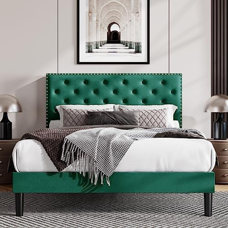 Modern Appearance Design: Comfortable and beautiful diamond button design and rivet element trim, which is exquisite in low profile, and suitable for various styles of space. Advanced Materials: The surface is made of soft Dutch velvet, which is skin-friendly and easy to clean. The interior of the bed is filled with environmentally friendly high-density rebound sponge and silk wadding, making the back more comfortable to lean on. Solid Structure: The bed frame is made of 12 wooden slats to provide you with reliable and stable support. The joints of the bed frame are connected accurately, and the contact surface is affixed with a silent bar, so there is no need to worry about squeaking. Sufficient Space Under the Bed: the height of the bed legs is 7.9”, which is convenient for cleaning under the bed, and storage boxes can be placed to increase space utilization without hindering the breathability of the mattress. No Box Springs Required: Mattresses can be placed directly on the wood slats, forgoing box springs saves even more money and time. This upholstered bed frame works with a variety of mattresses, including spring, memory foam, latex, or hybrid mattresses.