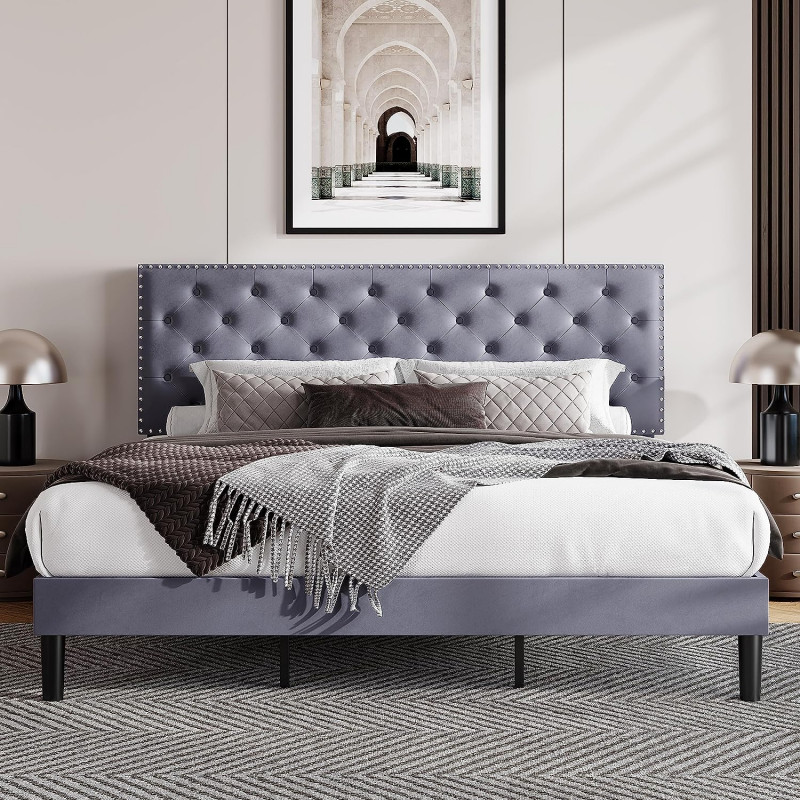 Modern Appearance Design: Comfortable and beautiful diamond button design and rivet element trim, which is exquisite in low profile, and suitable for various styles of space. Advanced Materials: The surface is made of soft Dutch velvet, which is skin-friendly and easy to clean. The interior of the bed is filled with environmentally friendly high-density rebound sponge and silk wadding, making the back more comfortable to lean on. Solid Structure: The bed frame is made of 12 wooden slats to provide you with reliable and stable support. The joints of the bed frame are connected accurately, and the contact surface is affixed with a silent bar, so there is no need to worry about squeaking. Sufficient Space Under the Bed: the height of the bed legs is 7.9”, which is convenient for cleaning under the bed, and storage boxes can be placed to increase space utilization without hindering the breathability of the mattress. No Box Springs Required: Mattresses can be placed directly on the wood slats, forgoing box springs saves even more money and time. This upholstered bed frame works with a variety of mattresses, including spring, memory foam, latex, or hybrid mattresses.