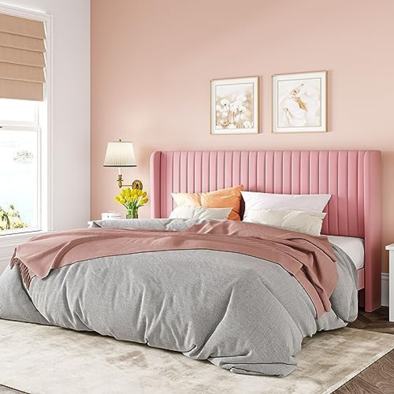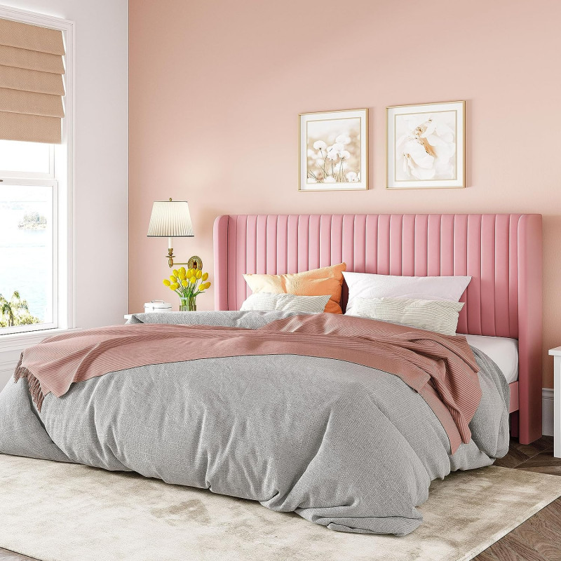 Comfortable & Elegant: Designed in a modern wingback headboard, smooth velvet, and soft sponge wrap the entire bed frame, which will add sophisticated style to any bedroom. Sturdy & Durable: Made with a sturdy high-quality metal frame and center support legs blend naturally into the sturdy frame to provide dense and strong support. Weight capacity: 800 Lbs. Thoughtful Design: 8" under-bed storage space is perfect for storing extra odds and ends. The sound-quieting features of the foot pads and sound-absorbing foam ensure a good night’s sleep. No Box Spring Needed: Durable velcro wooden slats are designed to support and extend the life of your latex, memory foam, or spring mattress. Mattress thickness recommended being 8"-12". Easy to Assemble: Comes with clear instructions, all the pieces are clearly labeled, and an adult could finish within one hour.