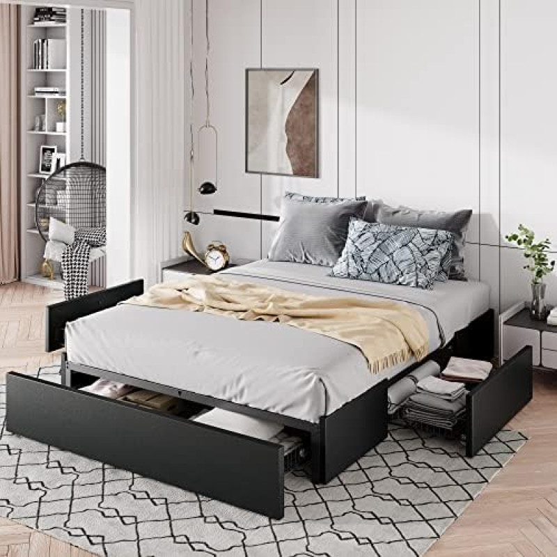 Simple & Modern: Modern low-profile design with a linen-look fabric fits various types of home decor. The comb of the fabric side panel and metal bed frame enriches your room with a simple and chic look Ample Storage Space: Designed with 1 side drawer on each side and 1 large drawer at the bed end, it offers perfect storage space for bed sheets, accessories, off-season clothing, etc. The 3 different size drawers allow you to manage your bedroom optimally. In addition, the drawers are quick-detachable Customizable Headboard: No fixed headboard design. With reserved holes in two legs, it can easily blend with all headboard decor, making room for you to customize your headboard according to your style Sturdy Structure: Strong Wooden slats system and low center of gravity design strengthen the sturdiness and durability of the whole bed structure. Weight Capacity: 800 lbs. Overall dimensions: 80.7 x 61.8 x 12 inches Anti-Noises: We provide Non-slip Strips pressed to the slats and a unique buckle structure design, helping stabilize the bed frame and prevent noise. Plastic foot plugs added to the bottom of the bed feet will never scratch your beloved floor. Dual protection to promise you a sound sleep