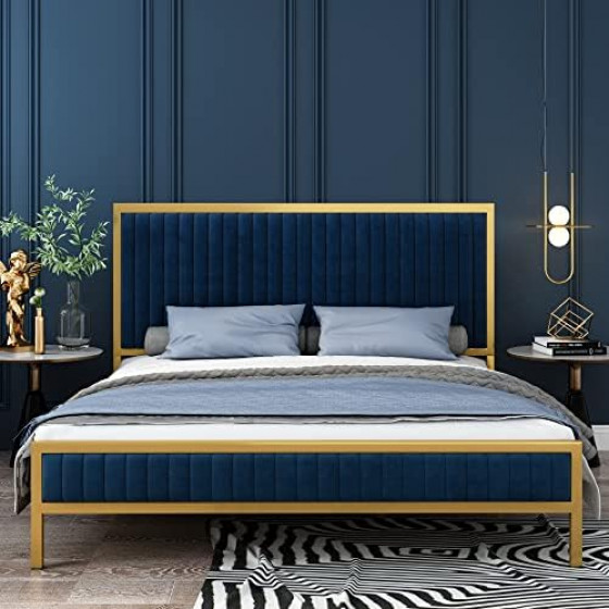 LUXURY STYLE: Premium lacquered metal frame combined with soft fabric brings you a regal ambiance. upholstered platform bed frame is not only stylish but functional as well. No matter what your style is modern or vintage, which is the perfect choice to decorate your room HEAVY DUTY METAL CONSTRUCTION: The 12 metal support legs and 12 thickened solid wood slats secured with screws play a significant role in the stability and durability of the platform bed,that can support about 900 pounds. NO BOX SPRING NEEDED (recommended mattress:10"-14") NOISE FREE BED FRAME: Extra special silent strips are added to the bed frame to ensures no shaky,squeaky and noise. The soft padding under each metal leg prevents your floor from being scratched. this modern bed frame will bring you a quiet night. STORAGE SPACE:The bottom of the bed frame is 9.5” from the floor to store some boxes or clothes case or shoes, keep your bedroom clean and more tidy. EASY TO ASSEMBLE: The king bed frame comes in a box that includes instructions and necessary tools. Follow the instructions to assemble it within 20 minutes. If there are any questions, please contact us.