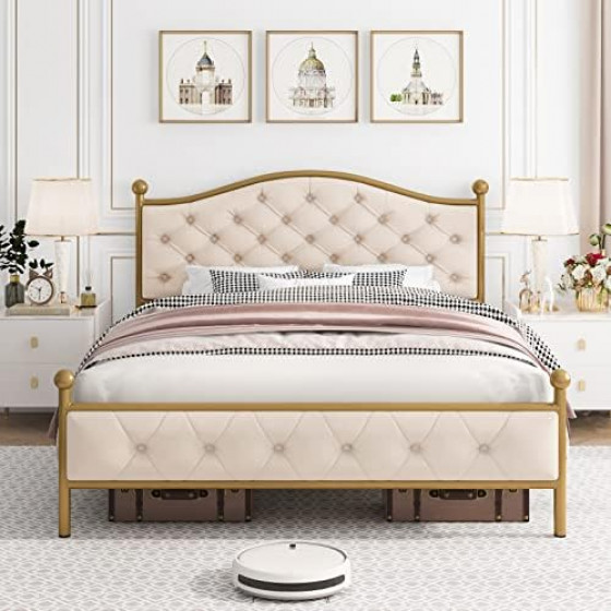 UPHOLSTERED & EXQUISITE: The soft, padded headboards of this beige bed frame are made of high-end luxury velvet fabrics filled with a high resilience sponge, providing added softness and comfort to support your body to lean on it with relaxation. Plus, the retro-elegant rounded ball design adds a touch of elegance and sophistication to any bedroom.