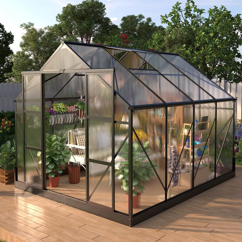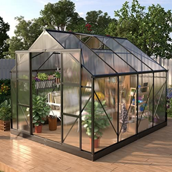 10x8x7.5 Professional Grade & Weather-resistant Backyard Greenhouse: Engineered with heavy duty and rust resistant aluminum frame (1.5mm) with inserted 6mm PC panels. Building level intensity allows to set multiply wall racks for placing heavy garden tools or hanging plants. (Max Load 1000lb) UV Resistant: 99.9% Wind Rating: 60 mph; Snow Load Capacity:18 psf