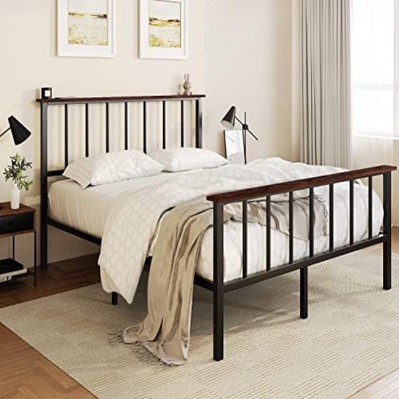 Simple & Practical Headboard: Black metal heavy duty combined with a mahogany upper top board, beautiful in appearance and simple in structure, adding convenience to life. Ample Under-bed Space: 12” of under-bed storage space, your bedroom space is fully utilized, and cleaning under the bed is no longer a problem. Noise Free: Isolation sponge strips and rubber stoppers prevent metal friction from making noise, allowing you to sleep peacefully. Optional Box Spring: The bed frame can be supported by steel slats without a box spring. Suitable for all kinds of mattresses, such as memory foam, latex, or hybrid mattress. Recommended mattress thickness 8''-12". Easy Assembly: Installation steps have been updated and many installation steps have been simplified. All parts and tools are in one box. There are detailed steps in the instructions, which can be installed quickly and successfully. If you have any questions, please contact us.