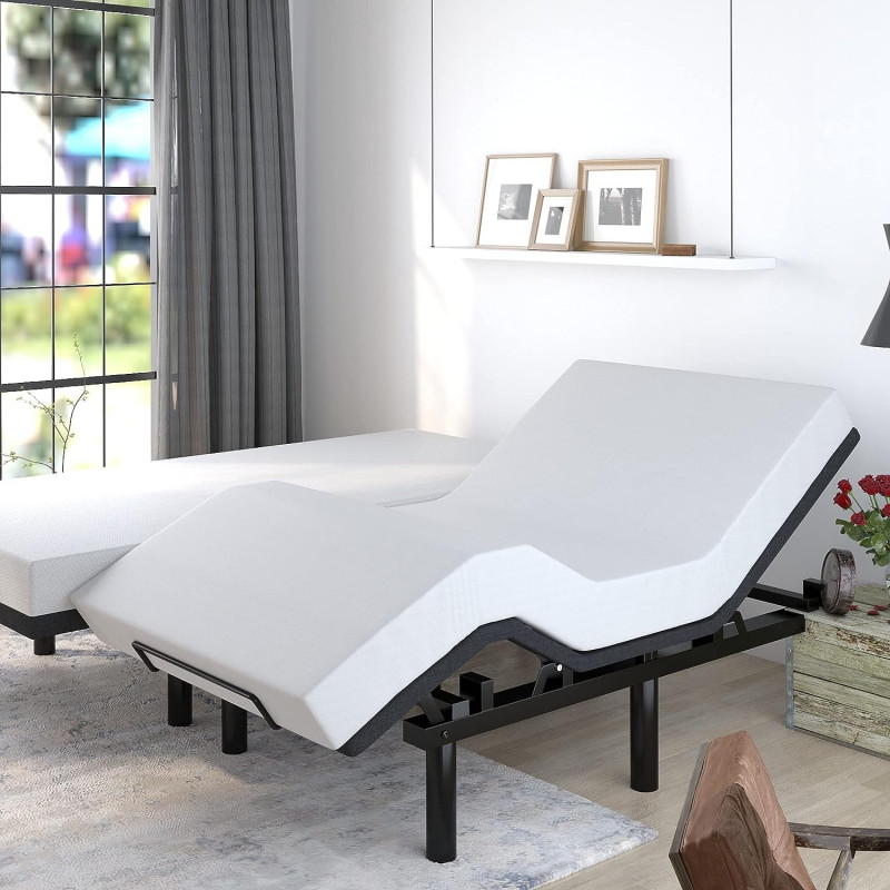 Head Elevation is 0-70 degrees and foot elevation is 0-45 degrees, driven by independent Heavy-Duty quiet Motors. 800 lift capacity, support you firmly and sturdy. Four Adjustment Modes: Back lifting mode suppors the waist to make watching more comfortable; Leg lifting mode, lift the leg to relieve pressure and relieve acid swelling; Lie down mode to improve sleep quality; Simultaneous head and foot rise mode, pull up spine, relieve waist and neck pain. 1.0 Gen boat-type motor, low noise, high weight capacity, suitable for pregnant women and the elderly. Wireless Remote Control: One-button intelligent control, unlock more angles, simple and convenient operation, the bed side also has intimate design pocket for remote control. Matching Mattress: The height of the base of our bed is compatible with a variety of mattresses, such as memory foam, gelatin foam, hybrid and latex foam mattresses, explore the ultimate in comfort, retainer bar and cloth covers prevent the mattress from sliding.(Note: we only have the bed base, the mattress needs to be purchased separately)