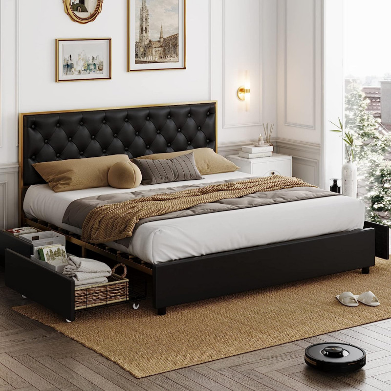 BED FRAME WITH STORAGE DRAWERS: Our storage bed frame with 4 steel drawers provides perfect storage space for daily necessities, such as clothes, bedsheets, etc. Each drawer is equipped with a smooth wheel for easy sliding in and out.