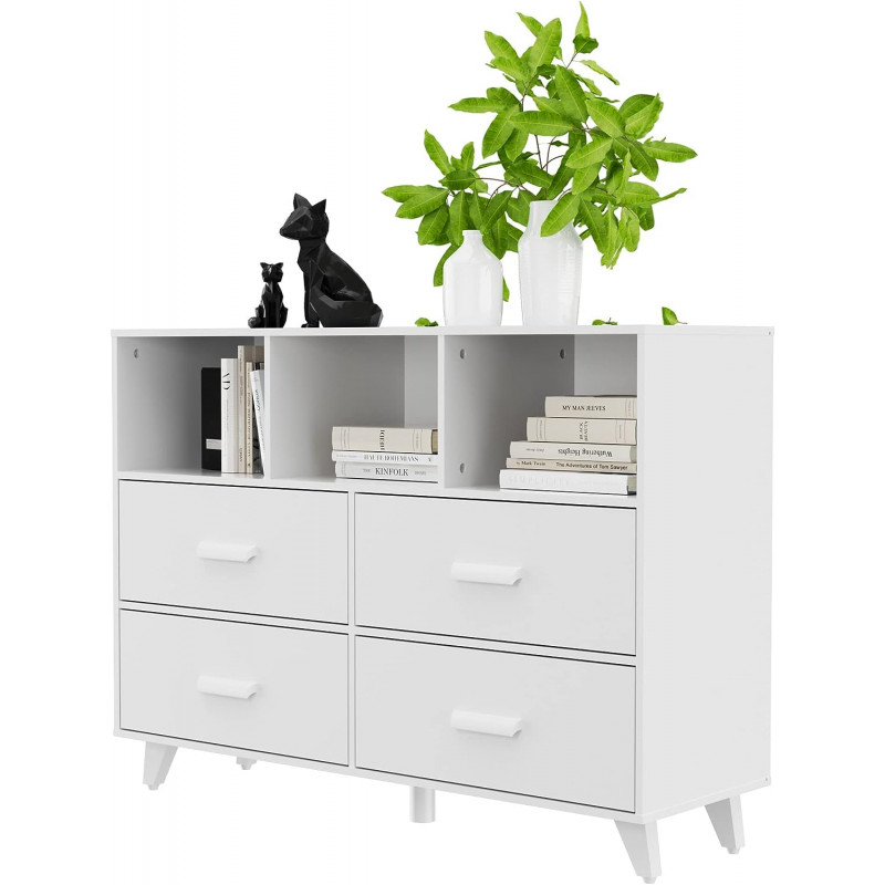 【Ample Storage Space】- Each of the 4 large drawers provides spacious storage space sized 20.3 "L x 12.3 "W x 8 "H with a load capacity of 22.05 lbs. per drawer. The 3 open spaces add more use possibilities to the dresser, in addition to storing books, magazines, and clothing that can be placed with favorite ornaments or artwork. It is an ideal piece of furniture that takes into account both neatness and beauty without taking up a lot of space in your home.