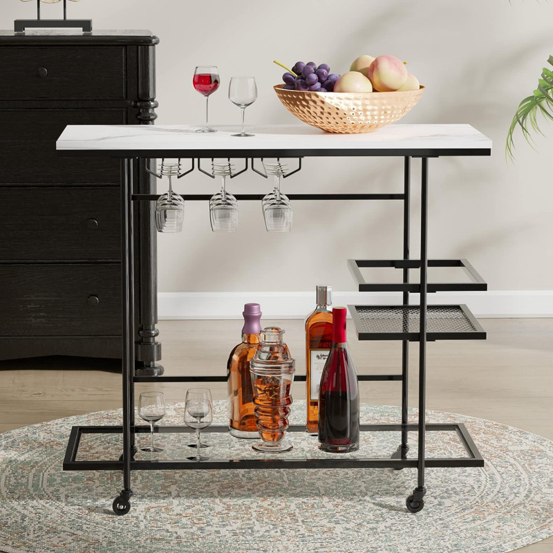 Stylish Mini Home Bar - This multifunctional serving cart features a sleek classic look that goes well with varied home decor. It's a mobile home bar for quality leisure time, a composite wood tabletop for beverage making, racks for stemwares, a metal mesh side tray for drying out, and a tempered glass bottom for shelving ice buckets, bottles, and any ingredient needed. Marble Pattern Tabletop - The marble pattern finish tabletop gives this cart a classic elegant look without compromising its mobility, the composite wood is much lighter and low maintenance. Underneath the tabletop, three stemware racks can keep all the wine glasses organized and easily accessible. Easy to Care - For daily care, just clean the rolling bar cart with a soft, dry cloth and it will stay new and clear for years. Don't use harsh chemicals or abrasive cleaning materials, it could damage the matte black powder coating. Tempered Glass Bottom - The glass bottom is clear and transparent, perfect for displaying your liquor collection. Plus, the tempered glass is stronger than standard glass and won't shatter into large shards when broken. The whole cart has a weight capacity of 140 lbs, approximately the weight of 50 bottles of wine, more than enough for regular use. Product Specification - Overall Product Size: 34" W x 14" D x 30" H; Tabletop: Marble Pattern Composite Wood, 34" L x 14" W; Side Tray: Metal Mesh, 11.8" L x 9.5" W; Bottom Shelf: Tempered Glass; Weight Capacity: 60 LBS for Each Shelf, 20 LBS for Side Tray; Mobility: 360° Casters, Back Wheels with Brake.
