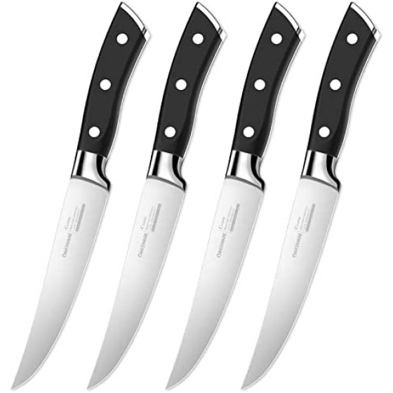 RAZOR SHARP STEAK KNIVES - Incredibly craftsmanship and sharpness, hand-sharpened to 17 degrees per side and expertly heat treated. Straight cuts with 5" of razor-sharp German steel honed to perfection, cut steaks easily and non-stick, with good balance and feel. The upward curved tip is designed to assist in separating meat from the bone easily.