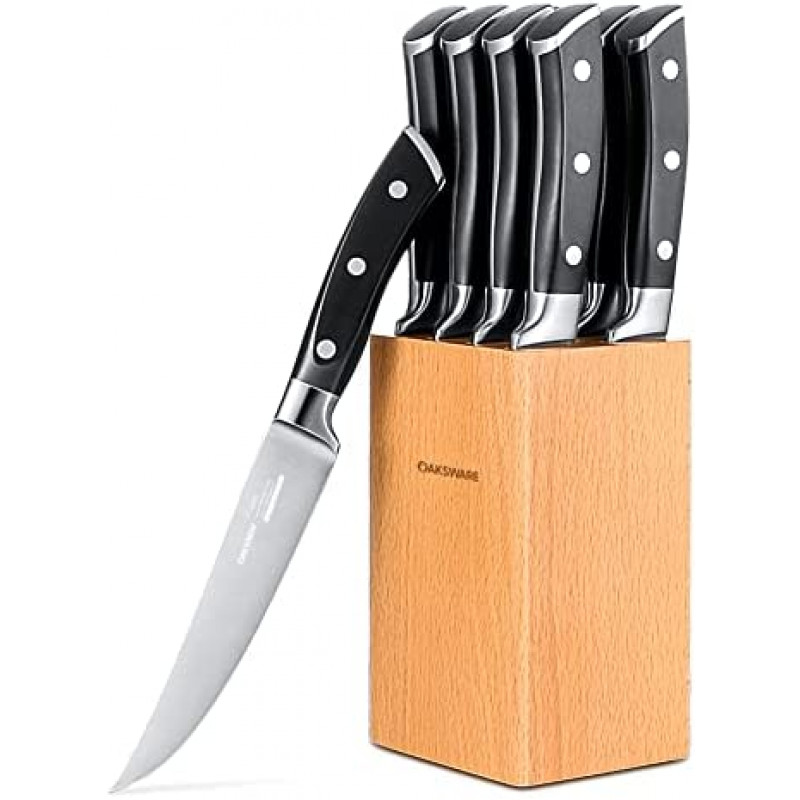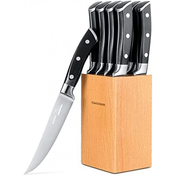 Who doesn’t love a juicy steak? A delicious meal is an important aspect of impressing your guests when hosting a dinner party. When you use our superior-quality, sharp and elegant, non serrated restaurant-style steak knives to fine cuts of meat will be impressing your guests, so this steak knife with the block is a must-have in your kitchen. PREMIUM GERMAN STEEL - The steak knife set of 8 is equipped with high-carbon German steel, which is hand polished and precisely forged by extraordinary quality stainless steel X45CrMoV15 / 1.4116 at 58 HRC to ensure this knife set is more sharp and durable. FULL TANG ERGONOMIC HANDLE - Precision-forged Full Tang with triple-riveted ABS handle with a Fully forged Bolster, which maximizes durability and stress tolerance, making it easier for the user to cut rib-eye steak and tenderloin and better for other kitchen works. Our steak knives are also friendly for left-hand people. EXQUISITE GIFT - If you’re looking for a stylish and practical housewarming, anniversary, birthday, or retirement gift for your friends or family, then the stunning steak knife set of 8 is your prime choice! And they're all stored in a chic wood block that will look great stovetop-side. CARE - To maintain the sharpness and glossiness of the steak knives, the kitchen knife is Hand Wash Only. Hand washing the steak knife with a soapy cloth under running water after every use, keep it dry and safe.