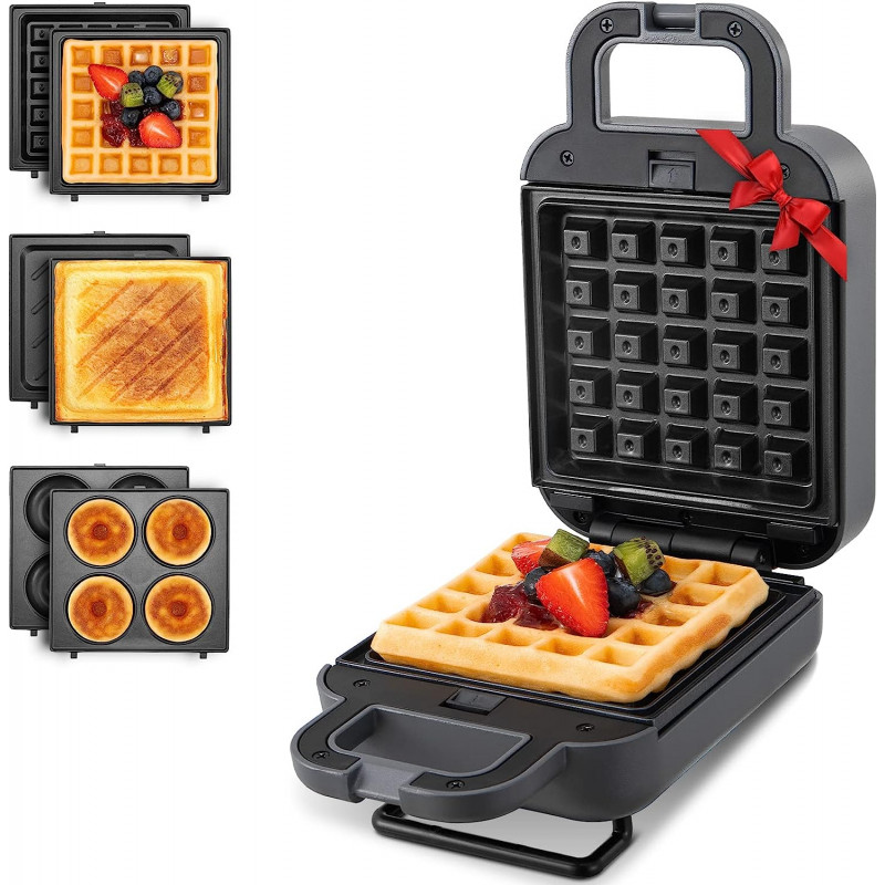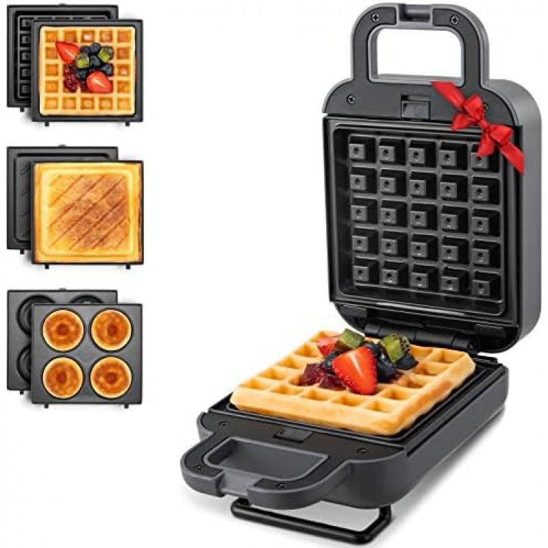 【3-IN-1 SANDWICH & WAFFLE MAKER】It comes with 3 sets of removable plates (5.2 x 4.7inches), waffle plates, sandwich plates, and donut plates, perfect for making individual servings, waffles, breakfast sandwiches, donuts, paninis, hash browns, grilled cheese, burgers, fruit, eggs, etc. It only takes one appliance to make a variety of cuisines. Get a 3-in-1 sandwich maker and start your DIY culinary journey! The elegant appearance makes it ideal for a wedding or housewarming gifts! 【COMPACT DESIGN & EASY TO STORE】Built for small spaces with compact design. The mini sandwich maker can be stored upright and takes up minimal cabinet space, which will match any kitchen decor. Easy to carry and lightweight, Perfect for college dorms, apartments, RV traveling, camping and all-size kitchens. It can be hidden line and stored easily in your kitchen cabinet or drawer. 【FAST & EVEN HEATING】600W Double-sided efficient heating system allows cooking fast and even, making them crispy outside and tender inside. Enjoy a warm and toasty delicious breakfast in minutes. It has indicator lights that let you know when the waffle maker is turned on, or when it’s preheated and ready for cooking. 【EASY TO CLEAN & DISHWASHER-SAFE NONSTICK PLATES】The plates of this breakfast sandwich maker are removable and made of high-quality food-grade aluminum with PFOA-free nonstick coating, making it ultra-easy to clean. Simply wipe them clean with a damp cloth once they've cooled, don't worry about messing up your kitchen. 【HEAT-RESISTANT HANDLE & SAFETY LATCH】The heat-resistant handle protects you from burning when opening and closing the lid, please ensure the lid is securely closed while cooking. Meets ETL safety standards, Please rest assured to use. 【NOTE】 When using this small waffle sandwich maker for the first time, plug in the power supply and preheat for about 3 minutes, the indicator light is off, and ready to cook. In addition, as the components inside do anti-rust treatment, the new product will have a slight smell when used for the first time. It is recommended the first heating process should take place without any foodstuffs, let it heat for about 5-10 minutes and it will be gone.