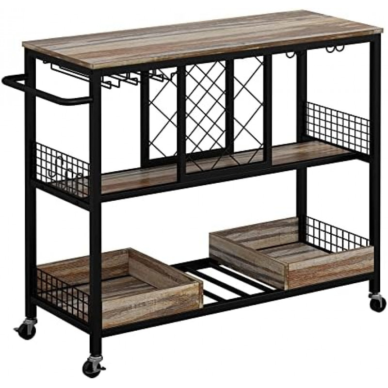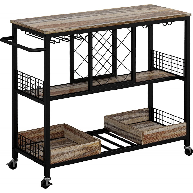 It is a perfect combination of wine holder, table top and wine glass holder.with 2 rows of hooks you can hang up to 12 mugs in it, and 3 hangers specially designed for hanging wine glasses. Measures 39.4"L x 15.7"x 35.4 "H. inches.this bar cart table on wheels can fit in many different places.lasting use and hold up to 300 lbs This wine table has an open storage compartment, with 2 rows of hooks you can hang up to 12 mugs in it, and 3 hangers specially designed for hanging wine glasses.It is a perfect combination of wine holder, table top and wine glass holder. Features four 360° swivel casters,2 casters with brakes, the wine cart is easy to move to serve your guests and can stop at your needs without accidental sliding. Based on excellent quality, we can provide 24-Hour friendly customer service, 30-Day Free Return and 1 Year Quality Assurance for wine rack table.