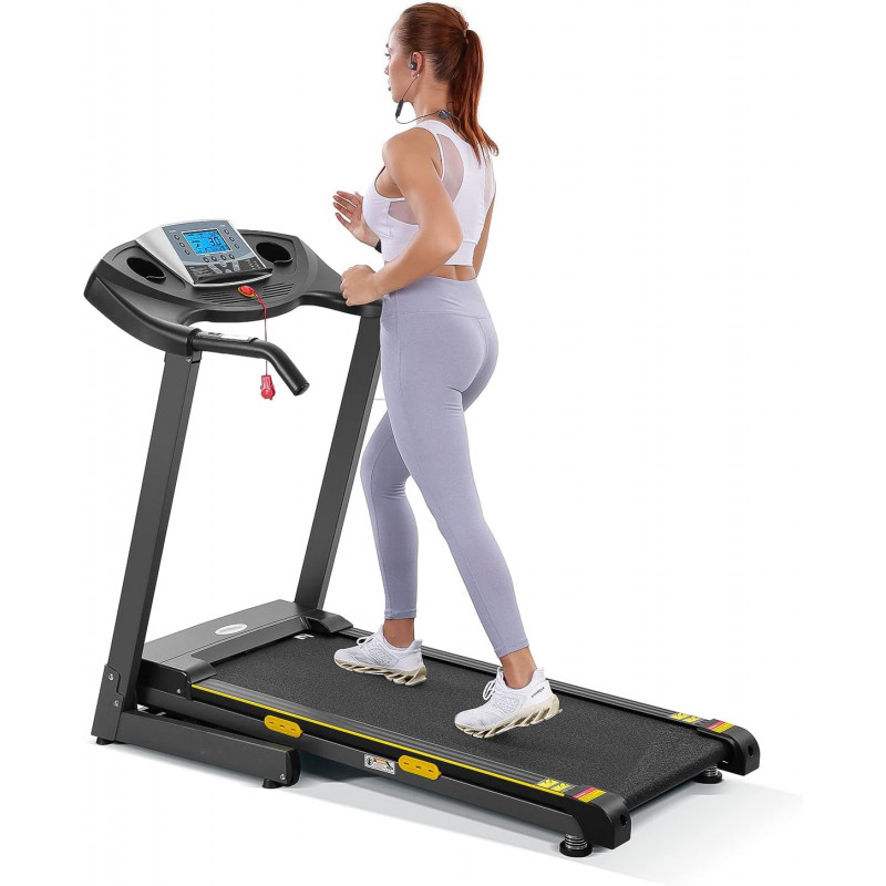 【SOFT DROP PLATFORM & ( 0-12%) AUTOMATIC INCLINE】The treadmill Designed with a soft drop system, you don't need to worry about damaging your floor. Also, this treadmill for home use is equipped with (0-12%) automatic incline which helps you personalize your workout for better results. Speed range of the incline treadmill is 0.5-8.5 MPH. More auto incline, more calories burn 【STRONG 2.5HP MOTOR & STURDY CONSTRUCTION】The treadmill for home use with a smooth and quiet treadmill motor and 15 Pre-set programs with treadmill allows for the user with a more challenging workout from beginner to advanced intensities. What's more, the incline treadmill with the tubular steel construction and a wide base provide secure stability and lasting durability. And the Max Load-bearing weight of the treadmill is 220 lbs 【MULTI-FUNCTIONAL DISPLAY & HEART RATE SENSOR】The incline treadmill with the advanced multi-functional LCD display can track your Time, Speed, Distance, Calorie, Incline, Heart Rate, Program and Modes. The handlebars of the treadmill also come with heart rate sensors, enabling you to monitor your heart rate during a workout. The acceleration/ deceleration buttons, built-in armrest controls on this treadmill to adjust the running speed easily.On this treadmill to adjust the running speed easily 【SOFT DROP PLATFORM & ( 0-12%) AUTOMATIC INCLINE】The treadmill Designed with a soft drop system, you don't need to worry about damaging your floor. Also, this treadmill for home use is equipped with (0-12%) automatic incline which helps you personalize your workout for better results. Speed range of the incline treadmill is 0.5-8.5 MPH. More auto incline, more calories burn 【SPACE SAVING and EASY TRANSPORT】 Foldable design with a compact size, the treadmill takes only a small space. And the protable treadmill for home use comes with the convenient wheels at the bottom provide easy and simple transport, and also better protect your floor. Compact foldable size of this treadmill is easy for storing under a bed or at the corner