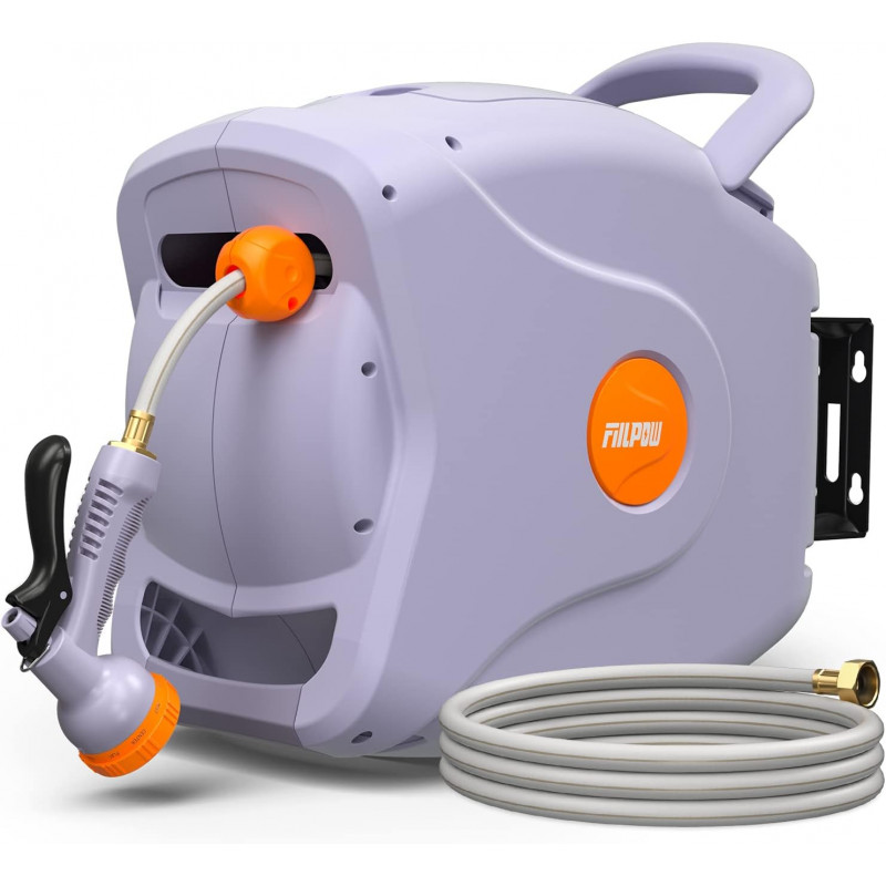 LOCKED AT ANY LENGTH & SAFETY LOCK: When you pull the hose to a certain length, it will lock automatically, so you don't have to hold it all the time, very convenient and labor-saving; by pressing the safety lock on the side panel you can lock the hose during its retraction, providing more safety for children and seniors EVENLY AND SAFELY AUTO-REWIND: The garden hose reel with an automatic rewind system, will retract the hose smoothly with a safe and steady speed by gently pulling, it takes 15-18 seconds to retract the 100 ft hose back without tangling or knotting; rigorously tested, the reliable structure can support 3000 cycles of retraction for durability RUGGED HOSE REEL FOR LONGER LIFE: The hose is made from new polymer with pressure resistance and toughness, not easy to bend or break; it can withstand up 350 PSI high pressure to ensure the hose reel is long-lasting; the fittings made of solid brass, a thickened waterproof and leak-proof rubber ring will not rust or corrosion STURDY SHELL & USER-FRIENDLY DESIGN: The outer shell of the retractable hose reel is made of anti-ultraviolet and weather-resistance PP material, which is not afraid of sun and rain; the front and back handle design is convenient for users to carry, featuring a clamshell design that allows for easy removal of the hose and interior cleaning 180°ROTATION & MULTIPLE PATTERNS NOZZLE: The robust wall-mounted bracket and the rotating shaft allow the hose reel to pivot 180 degrees, bringing the 100ft hose to water every corner of your garden; there are 8 spray functions (Mist, Shower, Cone, Angle, Full, Soaker, Flat, Center) for you to choose in different usage scenarios