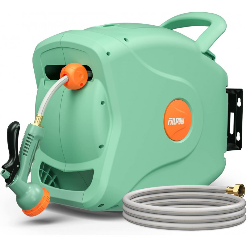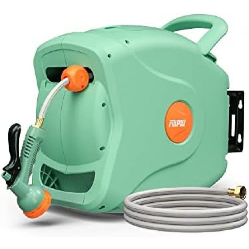 EVENLY AND SAFELY AUTO-REWIND: The garden hose reel with an automatic rewind system, will retract the hose smoothly with a safe and steady speed by gently pulling, it takes 15-18 seconds to retract the 100 ft hose back without tangling or knotting; rigorously tested, the reliable structure can support 3000 cycles of retraction for durability LOCKED AT ANY LENGTH & SAFETY LOCK: When you pull the hose to a certain length, it will lock automatically, so you don't have to hold it all the time, very convenient and labor-saving; by pressing the safety lock on the side panel you can lock the hose during its retraction, providing more safety for children and seniors PREMIUM & DURABLE MATERIAL: It adopts new-polymer hose that is freeze-proof, explosion-proof, and weather-resistant, and can withstand the maximum water pressure of 350PSI, making you work worry-free; the connectors of the inlet hose and outlet hose are made of solid brass with a waterproof rubber ring to ensure no rust and leakage 180° SWIVEL & ADJUSTABLE NOZZLE: The robust wall-mounted bracket and the rotating shaft allow the hose reel to pivot 180 degrees, bringing the 100ft hose to water every corner of your garden; there are 8 spray functions (Mist, Shower, Cone, Angle, Full, Soaker, Flat, Center) for you to choose in different scenarios USER-FRIENDLY DESIGN: Integrated carry handles ensure you have trouble-free carrying; the clamshell design allows the hose to be easily cleaned and replaced, so you can simply replace the hose by uncovering the lid; the whole shell is made up of UV and weather-resistant PP material which provide protection for your hose year-round under any weather conditions
