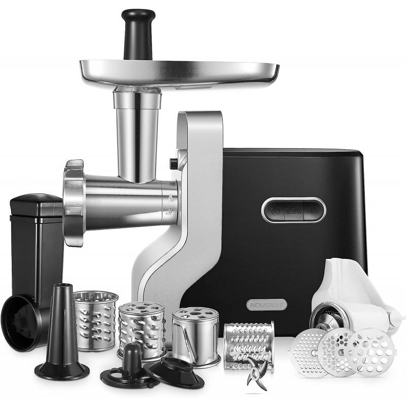 【5 in 1 Multifunctional】5 in 1 multifunctional meat grinder electric with 3 cutting plates (3mm, 5mm, 7mm), Sausage Stuffer, Vegetable Slicer, Kubbe & Tomato Juicing Kits, for grinding meat and fish, chop vegetables, grate cheese and squeeze fruits and vegetables. you can easily make mouth-watering hamburgers, meatballs, meat pies, sausages and other DIY healthy food.