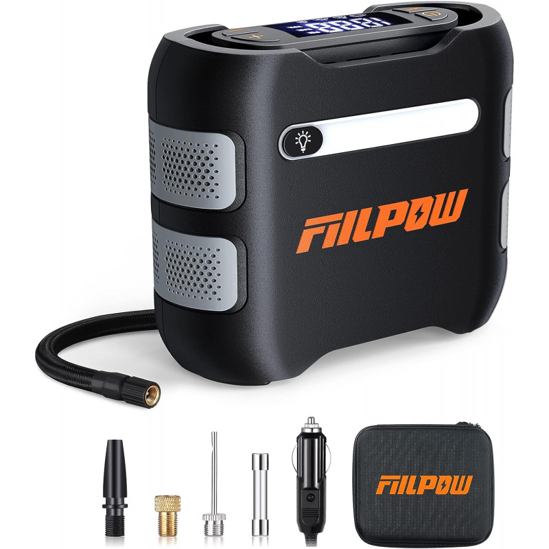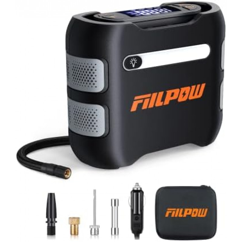 FAST INFLATION & 30 MIN CONTINUOUS OPERATION: Based on powerful inflation capacity that provides airflow of 30L/min, this tire inflator can inflate an R16 car tire from 1.8 to 2.5 Bar (26-36 PSI) within 2 minutes. Unlike other products that require the air compressor to rest and cool down after 10-15 minutes of continuous operation, our products can work continuously for 30 minutes without stopping, which is capable of inflating 4 tires at a time MORE INTUITIVE INTERACTION: Equipped with a 2.8-inch digital display and softer silicone buttons, it can help you easily check and set parameters including pressure value and unit(PSI/Bar/KPA), which delivers accurate pressure monitoring during work. High brightness LED lamp beads make your work easy even in the dark. Thanks to the automatic shut-off design when the desired pressure is reached, you no longer have to worry about over-inflation or under-inflation MULTIPLE MODES & EASY TO USE: There are larger and softer silicone buttons, 4 smart inflation modes (car, motorcycle, bicycle, and ball mode), preset pressure values and one manual mode. Comprehensively covering multiple inflation scenarios, it can guide users to operate clearly HIGH-QUALITY ASSURANCE: All FIILPOW products are fully inspected before leaving the factory. The surface made of high-qualified PC material can be guaranteed to all pass 10 tests of 1-meter drop at different angles without function damage. Up to a 300 times Product Life Cycle Testing ensure a longer service life FRIENDLY USER EXPERIENCE: It comes with a durable EVA carrying bag to make storage tidier and easier to carry, and avoid loss. It adopts an integrated storage design for storing 3*additional nozzles and 1*high-sensitivity fuse (250V 10A), and the 9.84 ft long power cable is also well stowed at the bottom