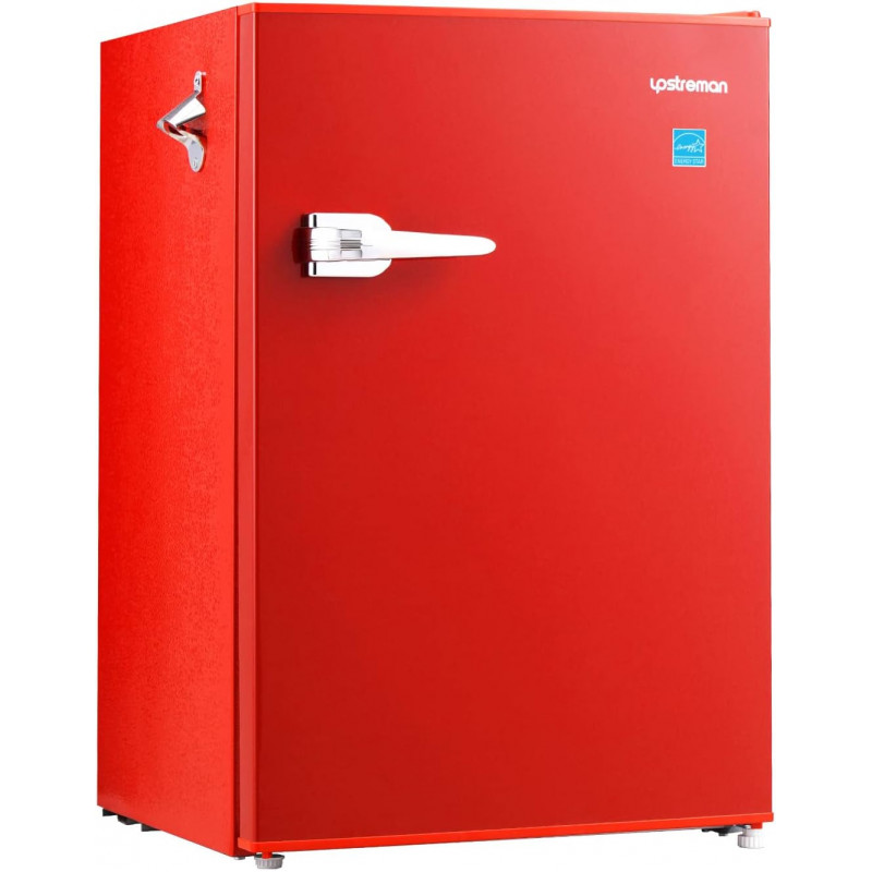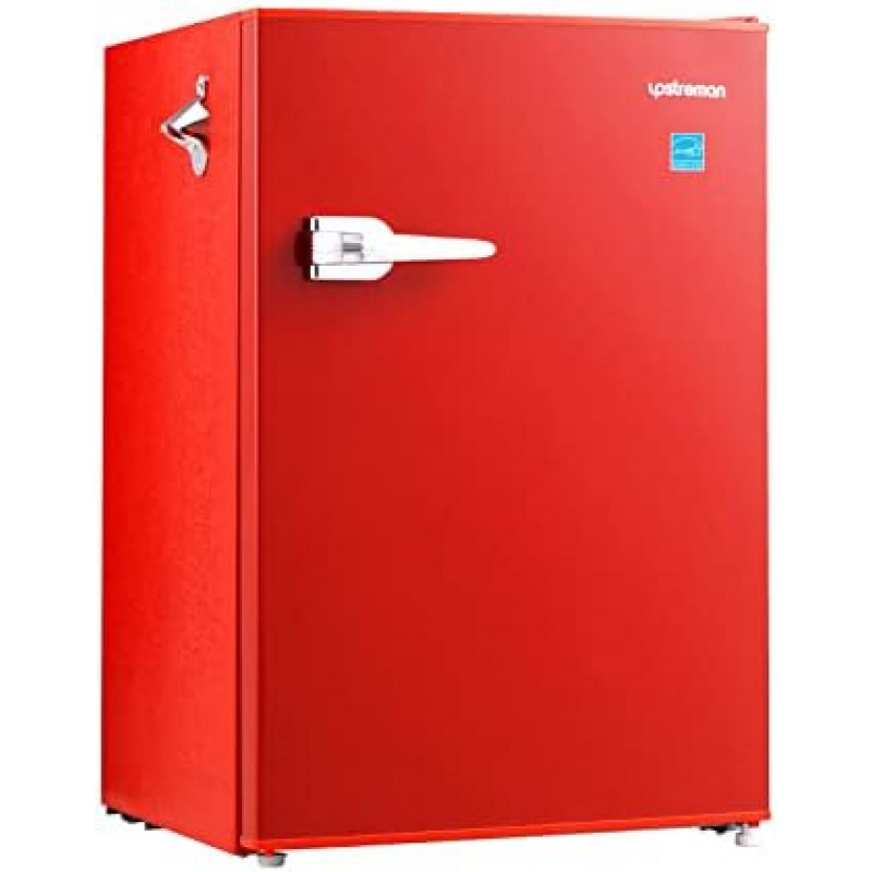 Retro Design: Upstreman Retro Series Refrigerator features classic chrome handles and bright red color, unique and stylish retro design complements your home decor elegantly, perfect for bedroom, kitchen, apartment, office, etc. Compact & Convenient: This compact retro fridge measures 17.5" *16.3" *26.7" (W*D*H) and has 2.5 Cu.ft(70.8L) capacity, which is space efficient. The side bottle opener makes it a breeze to open bottles, and slanted drink holders provide easy access to cola, soda, and more drinks. Adjustable Thermostat: This retro fridge is equipped with a 0.2 Cu.ft freezer, perfect for storing your favorite frozen foods(not for ice cream). The freezer is from 24.8° F to 42.8° F (-4° C to 6°C), cooler is from 35.6° F to 44.6° F (2°C to 7°C), and with 6 temperature settings. And the easy one-button defrost reduces the hassle of too much frost in the freezer. Ultra Quiet & Energy Efficient: The working noise is 38 dB, roughly at the level of a quiet rural area. Economic and quiet, you will hardly notice its existence when it’s cooling all your food & drinks, ideal appliance for your bedroom, study and quiet space. The energy cost is estimated to be as low as 0.57 kWh per day (210 kWh per year as tested to ENERGY STAR standards). Wide Application: This mini retro refrigerator is perfect for apartments, offices, garages, bars, game rooms, and with adjustable feet to accommodate uneven floors. Accessories include: 2 Shelves, 1 handle, 1 Bottle opener, 1 Egg rack, 1 Ice tray, 1 Ice scoop, 1 drip tray and 1 instruction manual. Please feel free to let us know if you have any questions.