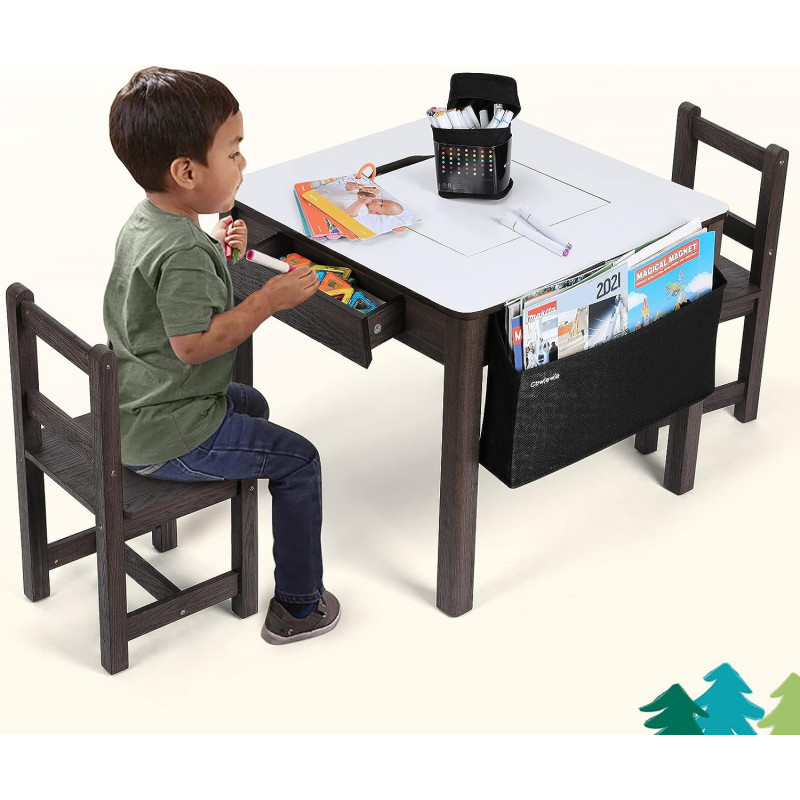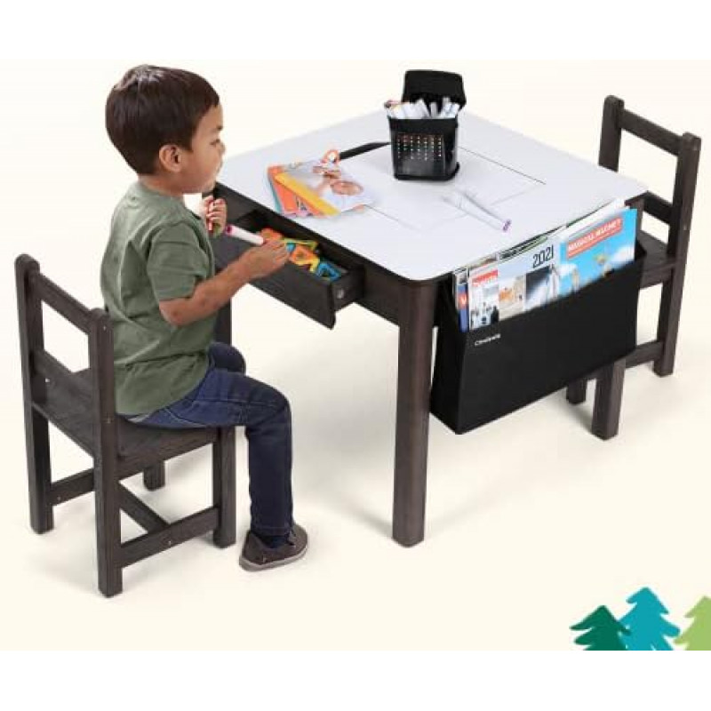 All-in-One Kids Activity Table: Cowiewie multifunctional toddlers activity table comes with 2 chair, a storage bag, 2 drawers& a big desk storage,a building blocks table and a double sided tabletop. It can as a duplo building blocks table, study table, play handmade clay table, painting table and dining table when turn over the tabletop; if removing it, it also can as a sand table and storage space. It's a wonderful gift for kids on birthday, Children's Day, Halloween, Christmas. GREAT STORAGE:Cowiewie toddler table and chairs feature built-in storage at the tabletop, and two drawers provide multiple locations for children to keep their toys, books and blocks neatly organized. The side organizer pockets can store a variety of picture books and toys. This design promotes children's independence, allowing them to learn to manage their belongings and develop good habits of keeping their play area neat and tidy. It stops your child's things from being cluttered and messy. Easy to clean and maintain: Thanks to its smooth frosted surface and easy-to-clean materials, this activity table set is easy to maintain. Whether your child spills paint or drops crumbs on the table, it can be cleaned easily. Easy mobility makes it perfect for use in any room of the house. The table's corner edges are all curved and designed for children to care for them without injury. Encourages independent play and learning: By providing a space for kids to store and stow toys with each school supply, the Cowiewie Toddler Table helps encourage independent play and learning. Children can play on their own or with friends to foster creativity and cooperation. The ergonomic design of the chairs is designed for children to develop good sitting habits, which allows children to better focus and concentrate during play and learning. DURABLE AND STRONG CONSTRUCTION: This activity table set is made of high-quality materials that are durable and can withstand the wear and tear of active children. The table and chairs have a sturdy construction that can support the weight of children and the toys they play with. This set is durable and will last for years.