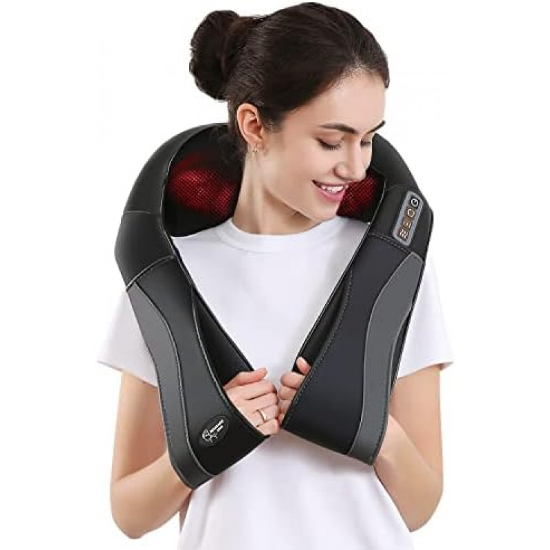 RELIEVE SORE & TIGHT MUSCLES: Enjoy the benefits of a professional shiatsu massage at home with 8 deep-kneading rotary nodes and an ergonomic U-shaped design. Relieve muscle aches and pains, neck stiffness, and eliminate neck fatigue. SAFETY HEATING MASSAGE: More effectively relieve muscle soreness and tension, knots, aches, and trigger points with the added heat function. Enjoy the heat during the massage and rest easy with the 15-minute automatic shut-off protection.(Can be manually closed). ADJUSTABLE STRENGTH: Customize your massage experience with three adjustable intensity levels (slow, medium, and fast) that alternate and automatically switch rotation per minute. PORTABLE & VERSATILE: Take your massage on the go with the included home power adapter and car charger (It must be plugged in to work). Use it in the office, car, at home, or while traveling for total body relaxation. The long cable length ensures extra space and comfort. PERFECT GIFT: Give the gift of wellness with this massager. Perfect for any holiday, birthday, Christmas, anniversary, Father's Day, Mother's Day, or other special occasions. Improve the wellness of your friends and family.