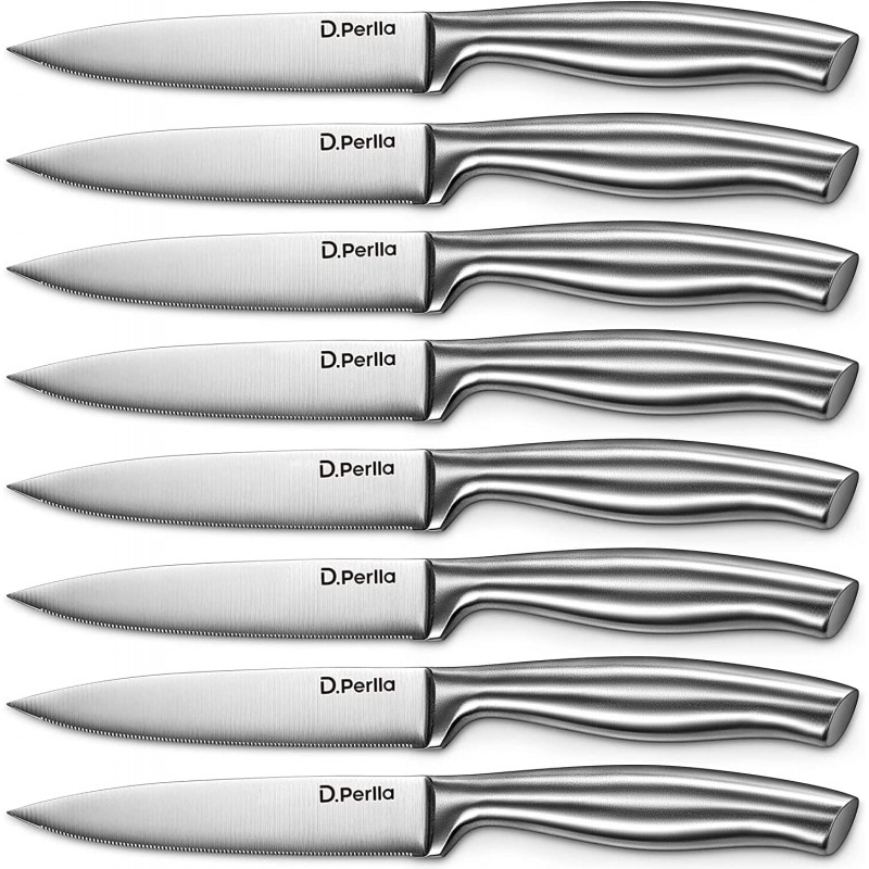 Never Need Sharpening Steak Knife: High quality high carbon stainless steel guarantees the rigidity and sharpness of the steak knife. At the same time, it has strong anti rust, anti corrosion, and anti tarnish capabilities. It is the best choice among steak knives. One Piece Forging Technology: The steak knife is continuously forged into one piece, and forged steel is used instead of stamping. There is no gap between the handle and the blade, which is safer during use and allows the knife to maintain better hygiene. Extremely Sharp: The steak knife is ready to use out of the box. The smooth and sharp blade can easily cut any hard steak. The serrated blade can always be sharp, no need to worry about polishing. Comfortable Hold Knife Handle: The curved and tapered handles are the best ergonomic design, and the steak knife has a moderate weight, which is very convenient to operate. It can be used for a long time without pain or fatigue. Long Term Use: The high quality stainless steel steak knife performs well in all aspects, but in order to be able to use it for a longer time, please clean it by hand. This set of steak knives is indispensable for both professional and amateur chefs.