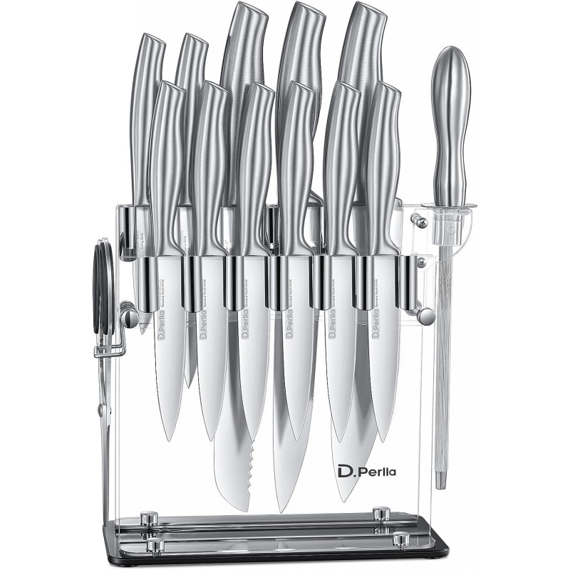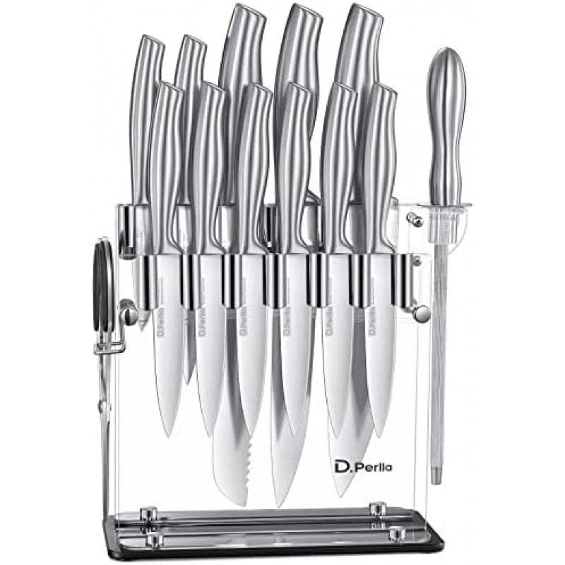 【Are you looking for a knife set that’s easy to use and storage ?】14 pcs kitchen gadgets set includes: 8" chef knife, 8" carving knife, 8" bread knife, 5" utility knife, 3.5" paring knife, 6pcs serrated 4.5" steak knife, 7.5" Sharpening Steel, 7.5” kitchen scissors and a clear acrylic stand. All accessories can be stored on the knife holder!