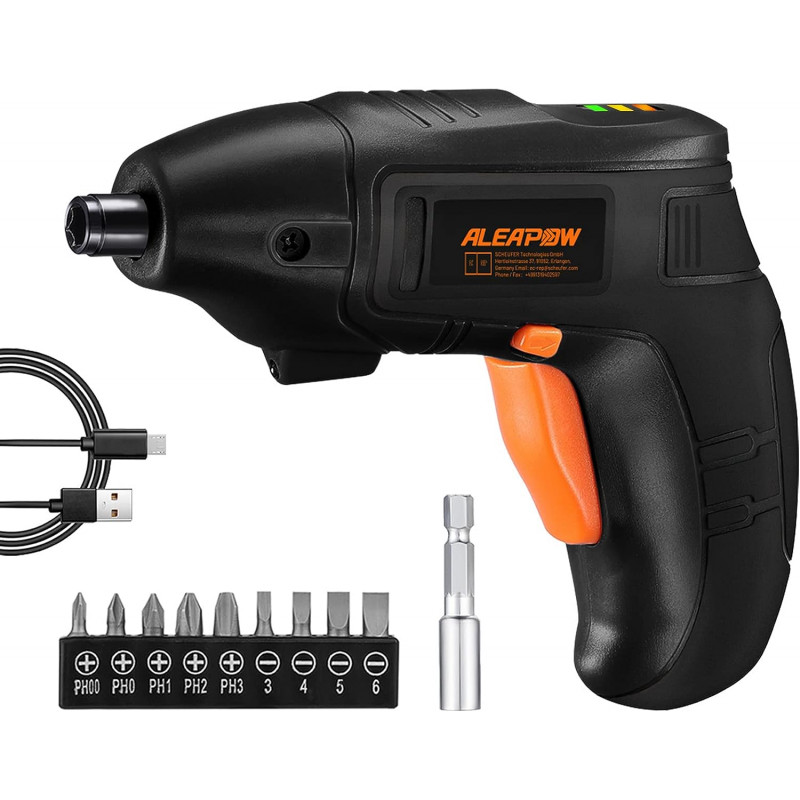 COMPACT SCREWDRIVER + DESIGNED FOR SMALL PROJECT - Only weighs 0.77lbs (350g), almost as light as a bottle of 330ml Coke, you can carry this electric screwdriver everywhere. This mini cordless screwdriver helps you handle most home projects including assembling furniture, fixing toys, etc DURABLE + 1/4'' MAGNETIC CHUCK - Equipped with a 2000mAh rechargeable battery, the electric screwdriver runs much longer than others, can continuously screw over 200 screws on a single charge. With the 1/4'' (6.35mm) magnetic chuck, the bits can be changed quickly and accurately, no worries about bits falling down during use, you can finish all tasks including hanging pictures, fixing cabinets, furniture, etc. The magnetic chuck is also compatible with any quarter-inch hex bit ERGONOMIC DESIGN + PERFECT ONE-HANDED TOOL - The ergonomic design handle of the mini screw gun fits your hand perfectly. Rubberized grip handle realizes perfect non-slip operation and added comfort. The On / Off / Run / Reverse / Forward switch design of this electric screwriver is considerate and user-friendly BUILT-IN LED LIGHT + EASY CHARGE - The bright front LED light can accurately illuminate your target screw to ensure your safety in dark environment and allows you to control larger area of your workpiece. With micro USB charging cable, you can charge the electric screwdriver by power bank, phone charger, computer USB port, etc. And the 3-level power indicator shows the remaining power PACKAGE CONTENTS - Assortment of 9pcs commonly used screwdriver bits and 1pcs extension bar help you handle household repairing projects; 1x micro USB charging cable makes charging easy and fast; 1x user manual help you start with the cordless screwdriver smoothly
