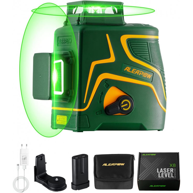 【5200mAh RECHARGEABLE BATTERY + TYPE-C PORT】The ALEAPOW LASER LEVEL is equipped with a high-capacity 5200mAh battery for amazing 6-24 hour battery life. It's also equipped with Type-C ports on both the body and battery, allows users to power the tool with direct input or power bank while charging the battery separately. Charging adapter included for more convenience. 【147ft (197ft PULSE MODE) + 2x360° GREEN LASER】The ALEAPOW 2D LASER LEVEL has a working range of 147ft, and the PULSE MODE extends the laser range to 197ft. The leveling laser generates three green-beam laser chalk lines in 360° laser planes - one horizontal and two vertical. With 3 projection modes, lines can be projected separately or together for a variety of levels and alignment applications. Its bright green lines provide up to 2 times better visibility than red lines. 【SELF LEVELING & MANUAL MODE + HIGH ACCURACY】SELF-LEVELLING—equipped with a Smart Pendulum System allowing for automatic Self-Leveling and indication of out-of-level conditions. Automatic leveling on inclined surfaces within 4°, if the surface inclines over 4°, the laser will flash to indicate out-of-level condition; MANUAL MODE—allows the user to lock the cross-line, once the pendulum is locked, it locks the line for use at any angle. The laser level has a high accuracy of ± 1/9" at 33 ft. 【MAGNETIC BRACKET + IP54 + PORTABLE BAG】360° Magnetic Bracket can be adsorbed onto metal track and steel, or hang on nails or screws for wood and cement wall; Covered by TPR soft rubber IP54, which is waterproof, dustproof, and shockproof to ensure proper working in complex working environments; Equipped with a portable bag for easy carrying and storage. 【PACKAGE CONTENTS + INTERNATIONAL CERTIFICATE】(1)ALPEAPOW 2x360° Laser Level; (1)USB-C Charging Cable; (1)5.2Ah Rechargeable Battery; (1)Battery Charger; (1)Portable Bag; (1)360° Magnetic Bracket; (1)User manual, CE / FDA / FCC / ROHS Certification. Please remove the protective film inside the battery before use; This laser level offers a 1/4 "-20 tripod thread, optional for use with the ALEAPOW T1 TRIPOD.