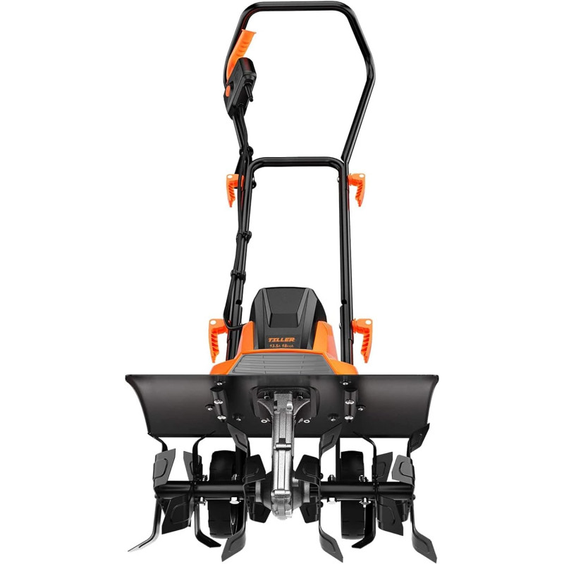 【Powerful Motor】The TGTL01A electric tiller with a 13.5 Amp motor & all-metal gearbox can generate up to 400RPM and cultivate up to 18 in W x 8 in. D. The cultivation area of the ENGiNDOT tiller is wider than other tillers on the market. 【Durable Tines】The TGTL01A electric cultivator has six durable all-metal angled tines, and the tilling width is adjustable(12-18in), so it is perfect for soil cultivation. 【Folding Design】The TGTL01A soil tiller has handle folds for convenient storage and easy transport. 【Safety System】Double safety switches provide double protection. The safety button on / off triggers to start the machine. And no gas, oil, or tune-ups make it effortless to maintain. 【Versatile Use】The garden tiller can use in vegetable gardens, orchard gardens, greenhouses, flowerbeds, etc. The tiller is suitable for loosening soil and removing weeds in small & medium gardens & flowerbeds.