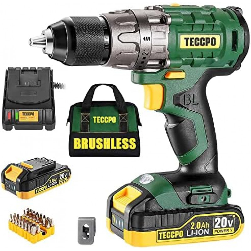 Outer covering : PA 66%+ Fibreglass 30% EFFICIENT BRUSHLESS MOTOR & HIGH PERFORMANCE: Why choose us? Our drill adopts brushless motor, BRUSHLESS is totally better than brushed. For brushless motors no need to change the carbon brush, which is more durable. Moreover, no sparks are generated during use. It's safer and no noise, which is more comfortable to use. TECCPO brushless motors deliver 530 in-lbs torque stably. This brushless drill driver delivers up to 57% more runtime over brushed, is high-performance, and more durable. 530 IN-LBS TORQUE & 2-SPEED & 21+1 CLUTCH: This power drill with high-performance motor delivers 530 In-lbs max torque. Variable 2-speed(0-400RPM & 1500RPM) provides accurate control, satisfying different demands of the application. Our cordless drill can reach the max torque when used at low speed. With screw sizes, M5-M6, woodworking holes are larger than 25mm. 21 + 1 clutch provides precise control for driving in/out screws and drilling into wood, ceramics, plastics, and even metal easily. 2000mAh BATTERY & 1H FAST CHARGER: Brushless drill driver kit with 1Pcs 2000mAh large capacity battery and 1-hour fast charger can keep the brushless drill running continuously. The battery makes the compact electric screwdriver always ready to use without restriction. This drill driver also has a power indicator to warn you of the state of the battery, making your work more efficient and convenient. 1/2" ALL-METAL CHUCK & FORWARD/RESERVE SWITCH: Compared with 3/8" plastic chuck, the 1/2” keyless metal chuck has unbeatable performance in providing maximum accessory compatibility and durability. Cordless drill set with the forward/reverse switch design, allows you to either screw or remove /replace bits for your purposes. This cordless drill also with ergonomic design of rubber-covered handle, which provides a comfortable grip for being breezily operated in one hand. COMPACT & LED LIGHT & 33 PCS ACCESSORIES: This brushless drill driver weighs only 3.37 lbs with battery, which is perfect to reduce user fatigue and easy access to the tight area. LED Light for illuminating the workspace when used in darker areas and ensuring work accuracy. TECCPO electric drill cordless with 33pcs premium accessories for multi-purpose, perfect for household reconstruction, renovation, garden work, DIY handcrafts or garage repairs, etc.