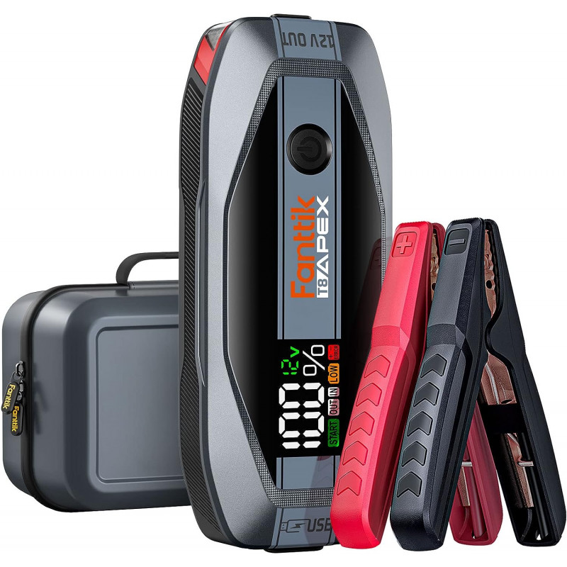 [Titan's Power] With Titan’s jump starting power for instantaneously engine starts. Rated at 2000 Amps, this lithium car battery jump starter unleashes maximum energy to start your dead battery, especially for your supercar up to 8.5L gasoline engines and 6.0L diesel engines. [Smart Detection Display] Features 3.0 inches smart screen for convenient use, this portable car jump starter pack can intelligently detect and display the battery voltage in real time, and the remaining battery level, to get you know everything at a glance. [Rapid Charging] Only needs 5-minutes of charge from 0% to a single jump starting for you to hit the road again immediately. With 65W USB-C power delivery input and output, the battery pack completely recharges in 1.5 hours; Also enough to power up your MacBook Pro 13’’, laptops, phones, and other USB-C devices. [Extreme Safety] We adopt TenSafe technology and improved upon it. With our mistake-free design featuring reverse polarity and spark-proof technology, you have no worry of incorrect connections. And with enhanced thermal efficiency and power management to provide stronger performance and longer battery life. [What You Get] T8 APEX Portable Car Battery Jump Starter Pack(IP65 water resistant and flame retardant, Heavy-Duty Battery Clamps, USB C to C Charging Cable, 65W Fast Charger, Car Charger, PU Storage Bag, User Guide, Reliable Customer Service and Lifetime Expert Tech Support.