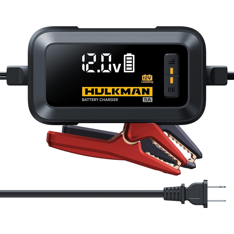 Note: It's a battery maintainer/trickle charger rather than a jump starter. The Newest Arrival of 2022: With a new industrial design that is more compact, more attractive, and simpler to use than your average car battery charger, Sigma 5 stands out from the crowd. Best of all, it is not only a battery charger, but also a battery maintainer, battery desulfator, and trickel/floating charger. Combined with its pure copper clamp, Sigma 5 offers customers the best charging experience ever. Smartest Charger Ever: HULKMAN's smartest car battery charger yet, the Sigma 5 is built with next-level intelligence. Using its nine-step charging technology, Sigma 5 can now maintain your battery overnight or for an even longer period, with zero attention needed and complete dependability, creating a totally hands-free charging experience. Read With Ease: Once you plug in and attach the battery, a huge 3.2-inch LED screen intuitively indicates the battery level, voltage, and charging mode. Simply select a charging mode and it will begin delivering the power to your battery, making your charge easier and better than ever before. Save Dead Batteries: If your battery has died, you can now charge dead batteries with our Advanced Loading Mode, a scientific charging process that delivers significant current power through qualification, soft start, and pulse mode, as well as recondition and bulk stages, to stimulate dead batteries back to life. One For All: This charger is compatible with either 6V or 12V sealed lead-acid, and 12V lithium-ion batteries, including deep-cycle, AGM, lifepo4, flooded, gel, wet, maintenance-free, EFB, and calcium batteries. Super Repair Mode: This car battery charger can accurately recognize bad batteries. By implementing the 12V “Super Repair Mode,” you can enhance your battery performance in only four hours and avoid purchasing an unnecessary replacement by reducing sulfation build-up and acid stratification with pulse cycles, thus offering you a cost-effective, money-saving, and environmentally friendly battery solution.