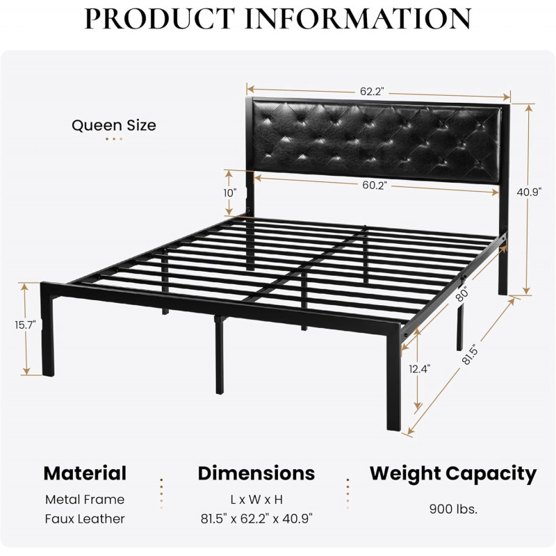 SHA CERLIN Queen Metal Platform Bed Frame with Faux Leather Upholstered Button-Tufted Headboard, Mattress Foundation with 12.45" Storage, No Box Spring Required, Easy Assembly, Black