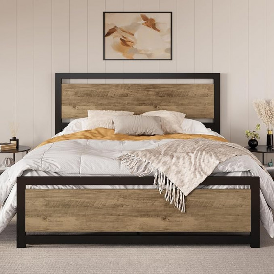 Sturdy Construction: A sturdy metal frame and solid solid wood make up this bed frame. The reinforced frame and carefully selected wood planks make it durable.